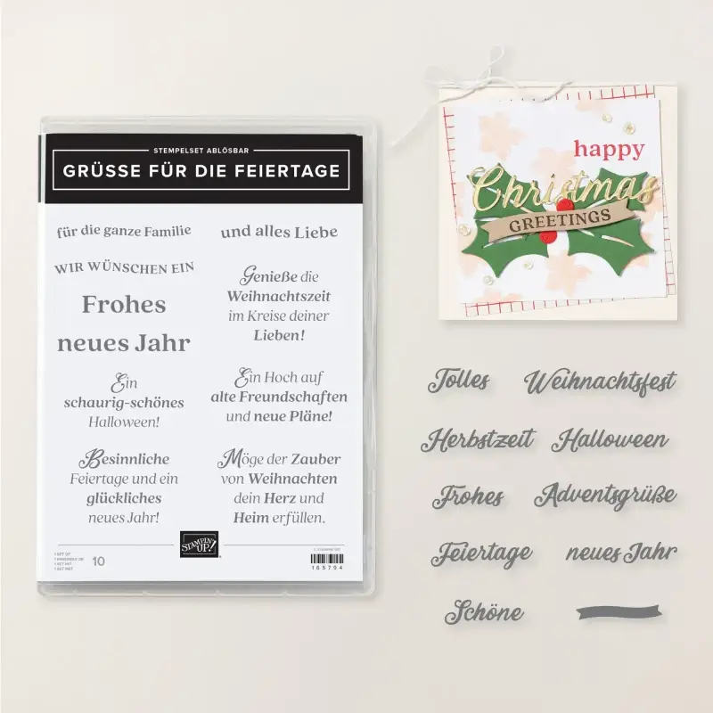 Auf dem nächsten Bild siehst Du eine festliche Variante der Verpackung, die perfekt zur Weihnachtszeit passt. Für dieses besondere Design habe ich das Designerpapier Weihnachtstraditionen sowie das Produktpaket Grüße für die Feiertage von Stampin' Up!® verwendet. Der Schriftzug auf der Vorderseite verleiht der Verpackung eine festliche Note.